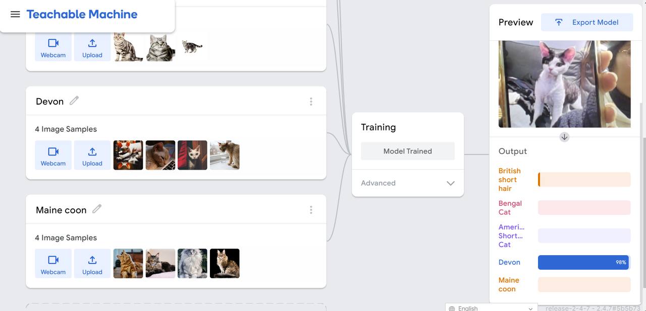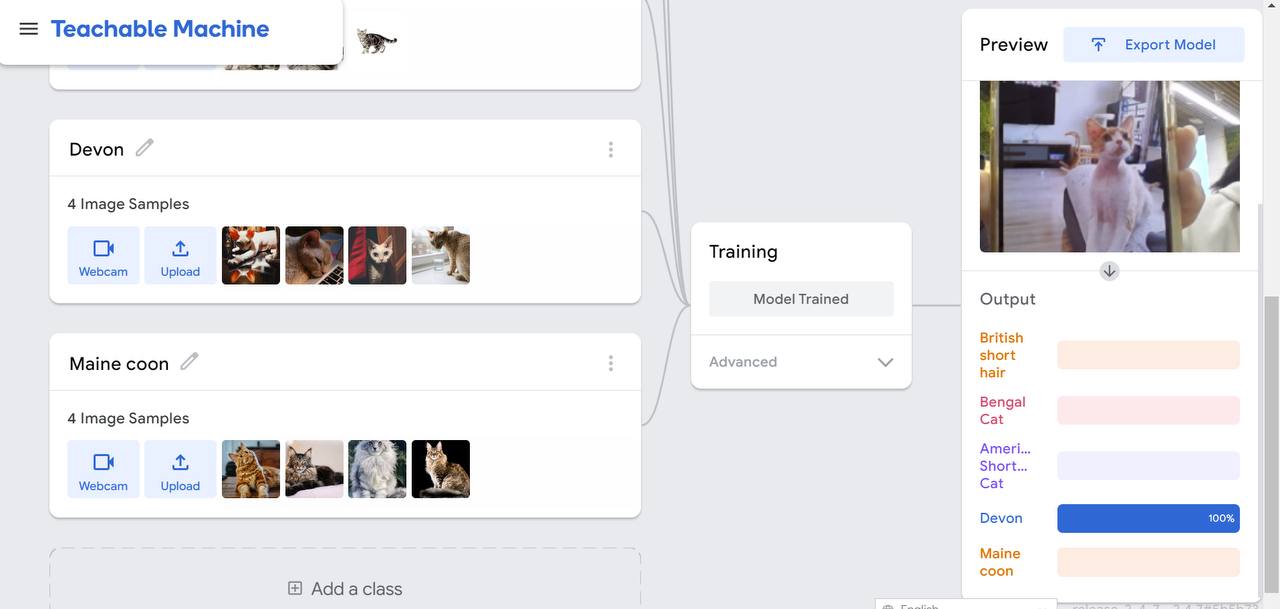 In this webpage, I embark on a project to identify specific cat breeds. This tool, which can be found on Teachable Machine, allows me to classify five cat breeds: American Shorthair, Bengal, British Shorthair, Devon, and Maine Coon. After uploading the relevant information to the website and setting up the classifications, I proceed to test the system's accuracy in recognizing these breeds.