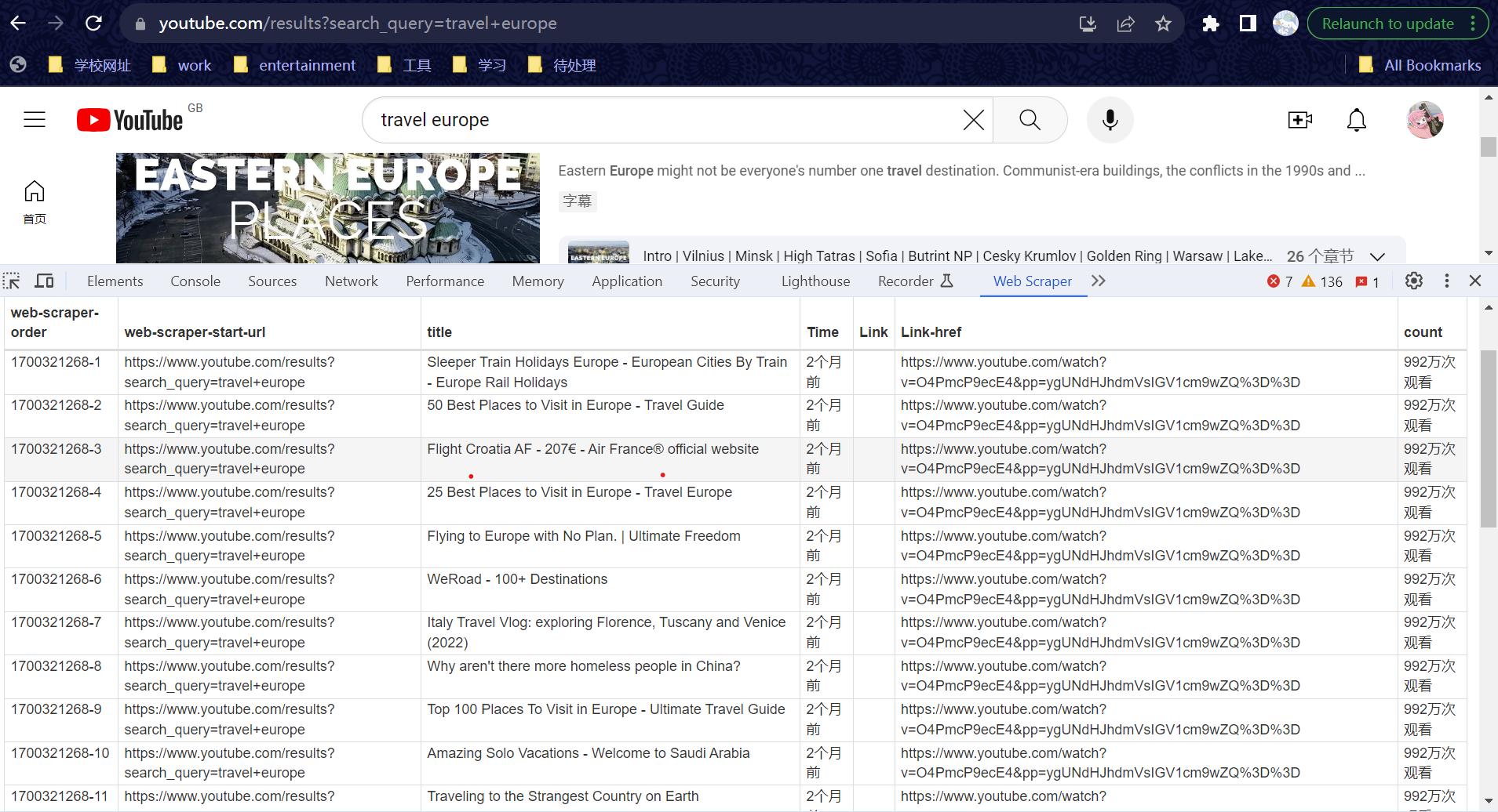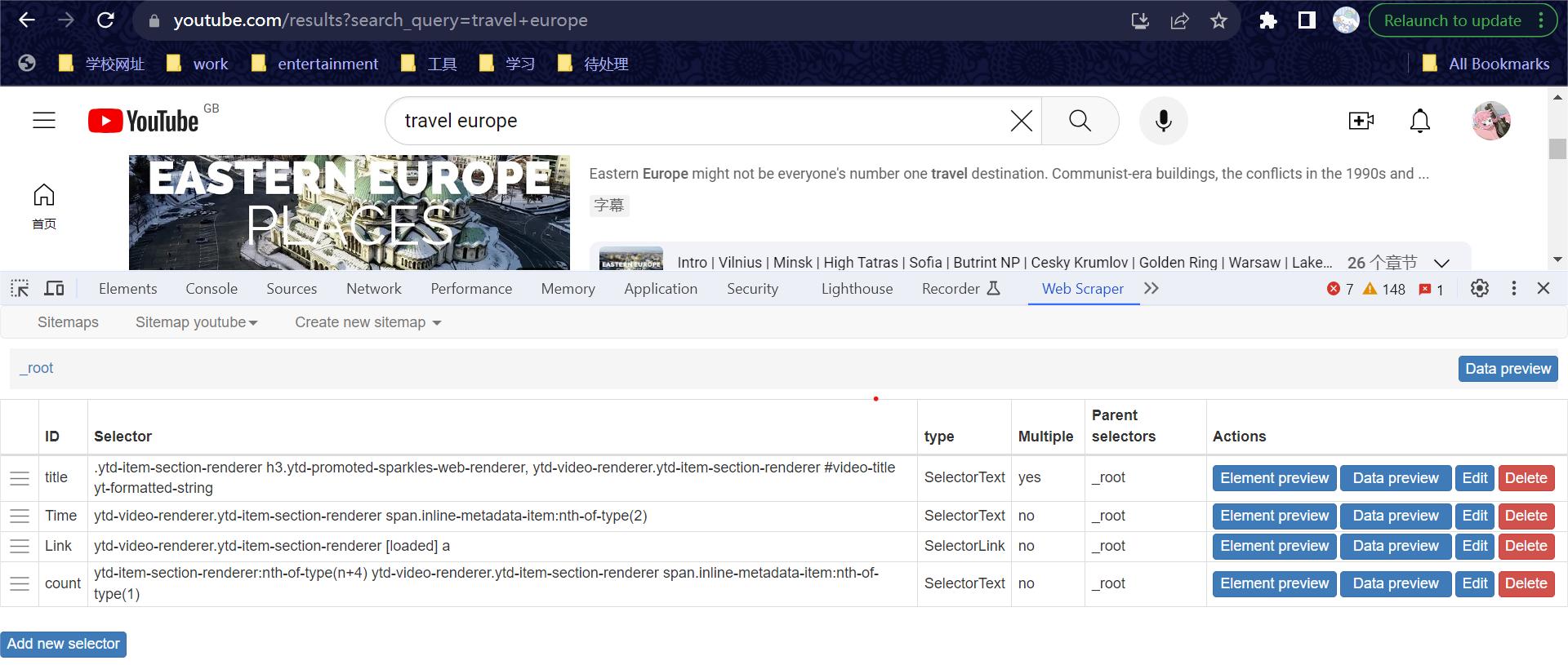 On this page, I will demonstrate my process of web scraping on YouTube using the WebScraper.io extension. The focus of my project is to scrape videos related to 'Travel Europe' on YouTube. My aim is to identify popular destinations and understand the types of travel videos that resonate with viewers. To begin, I entered 'Travel Europe' as my search query on YouTube. Next, I created a new sitemap and added new selectors to extract key components from each video, including the title, release date, link, and view counts.